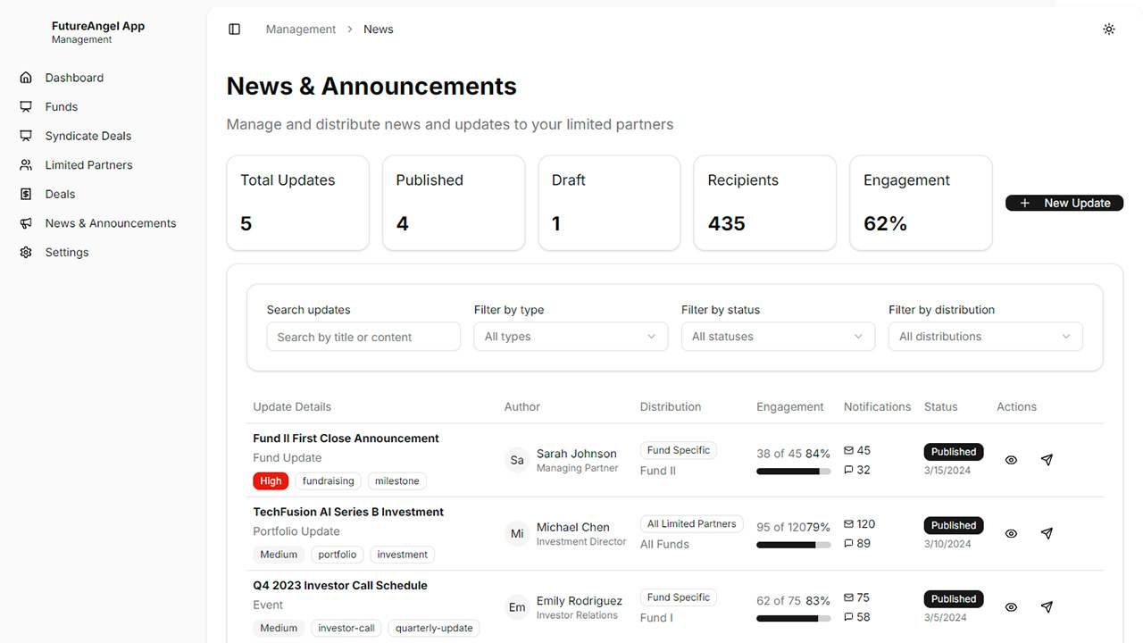 - A live view of fundraising and portfolio health